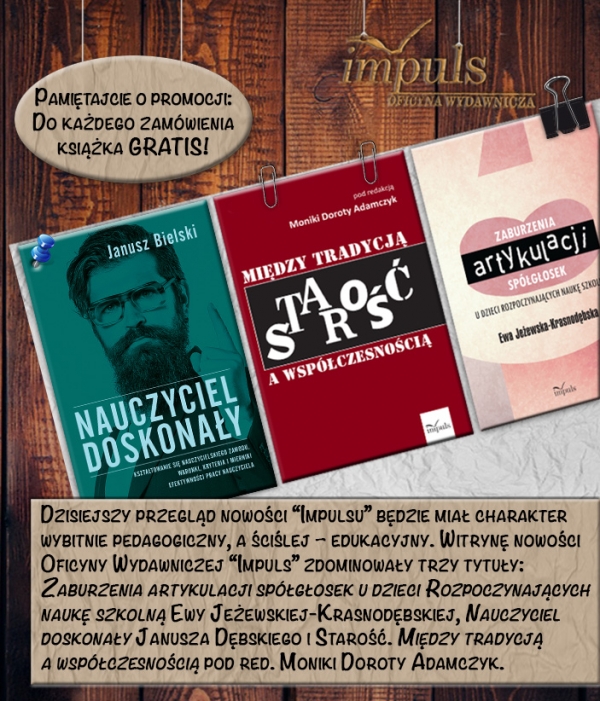 Witrynę nowości Oficyny Wydawniczej Impuls zdominowały trzy tytuły: Zaburzenia artykulacji spółgłosek u dzieci rozpoczynających naukę szkolną Ewy Jeżewskiej-Krasnodębskiej, Nauczyciel doskonały Janusza Dębskiego i Starość. Między tradycją a współczesnością pod red. Moniki Doroty Adamczyk.