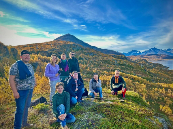 Od lewej: Wojciech Stanisławski (jury), Małgorzata Kleszcz (Radio Wnet),Maciej Papierski, Małgorzata Boryczka, Damian Kowal, Marta Michalak, Katarzyna Nowak-Szelejewska i Krzysztof Niewiadomski (jury) na zaskakująco słonecznej Uløyi.
